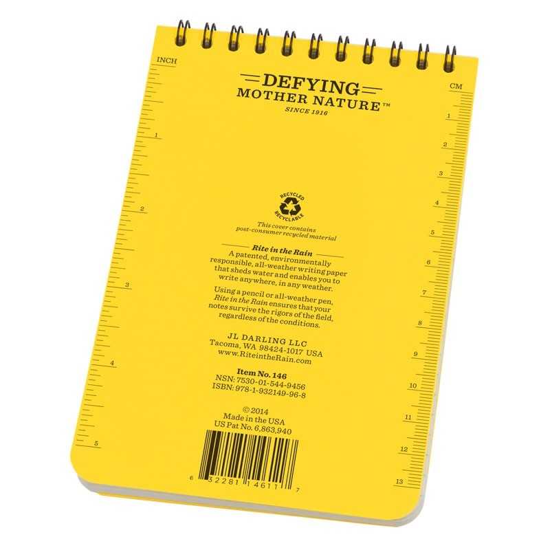 Πολύ πρακτικό σημειωματάριο τσέπης της Rite In The Rain με ειδικά εμποτισμένες σελίδες που αντέχουν στο νερό, τον ιδρώτα, τη βροχή, τη λάσπη, τα λάδια κ.α. Είναι ιδανικό για όλους τους λάτρεις των outdoor δραστηριοτήτων, για την παραλία, το σκάφος, για όσους εργάζονται σε λιμάνια, πλοία κ.λπ. Κρατήστε τις σημειώσεις σας άφοβα στην παραλία ή σε μια ορεινή εξόρμηση χωρίς να φοβάστε να βραχεί το χαρτί από τη θάλασσα ή από μια ξαφνική νεροποντή. Εξίσου χρήσιμο και για καθημερινό σημειωματάριο στην πόλη, διαθέτει 100 σελίδες που κρατάνε τη φόρμα τους ακόμα και αν βραχούν. Είναι συμβατό με όλα τα μελάνια (εκτός από τα υδατοδιαλυτά). Τέλος, στο εξώφυλλο από PolyDura θα βρείτε πολλές πληροφορίες σχετικά με μετατροπές μονάδων (π.χ. από εκατοστά σε ίντσες). Διαστάσεις: 15,5 x 10,5 cm.