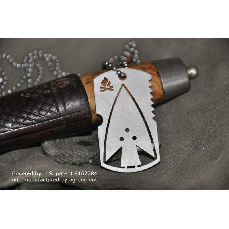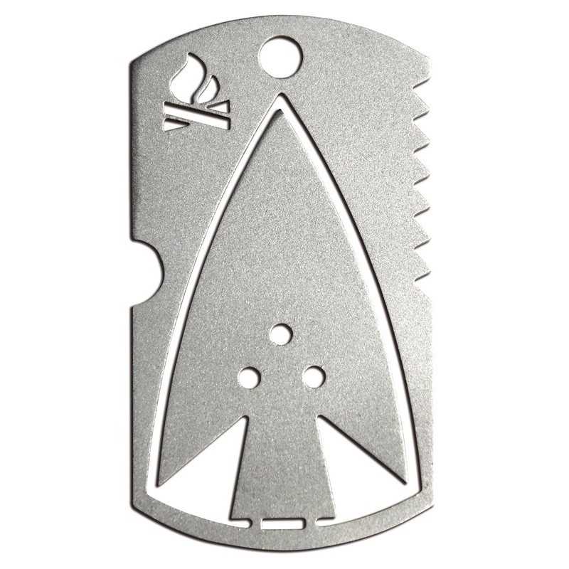 Εξαιρετικής ποιότητας dog tag επιβίωσης με 1 αποσπώμενη μύτη για βέλος ή δόρι. Πάνω στο dog tag υπάρχει επίσης ένα μικρό πριόνι και λάμα για γδάρσιμο ή σκάλισμα. Η λάμα δεν είναι τροχισμένη επίτηδες για λόγους ασφαλείας. Η κατασκευή είναι από ανοξείδωτο ατσάλι για ανθεκτικότητα και αντοχή στο χρόνο. Απαραίτητη προσθήκη για όσους θέλουν ένα άριστα εξοπλισμένο σακίδιο επιβίωσης. Προσοχή όταν το φοράτε γιατί μπορεί να αφήσει σημάδια στο δέρμα ή στα ρούχα σας.