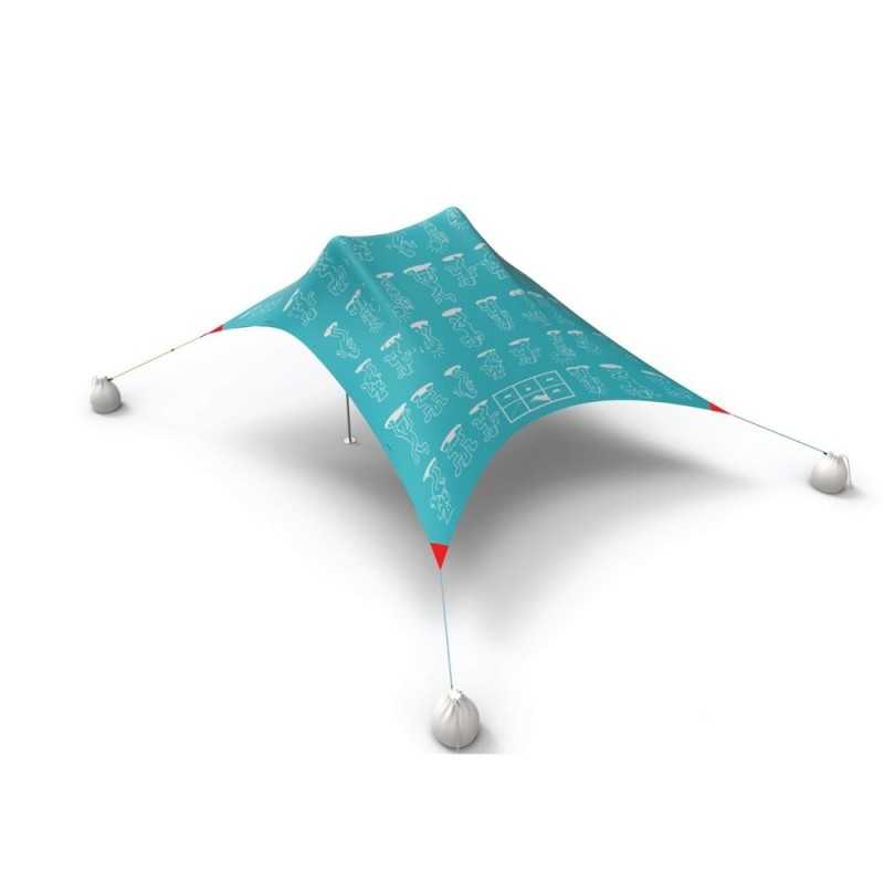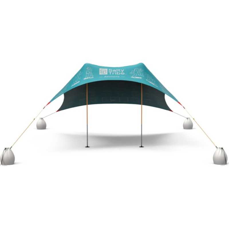 Η ελαστική τέντα παραλίας της Salty Tribe τοποθετείται εύκολα και γρήγορα ακόμα και όταν φυσάει πολύ στην παραλία. Απλώνετε το πανί στο έδαφος και το ενώνετε με τους 4 σάκους τους οποίους γεμίζετε άμμο ή βότσαλα. Το ελαστικό πανί της τεντώνει με τους 2 ορθοστάτες και η τέντα σταθεροποιείται στο έδαφος με τους 4 σάκους. Εξαιρετική επιλογή για την παραλία, θα σας βγάλει ασπροπρόσωπους με τα μελτέμια του Αυγούστου.