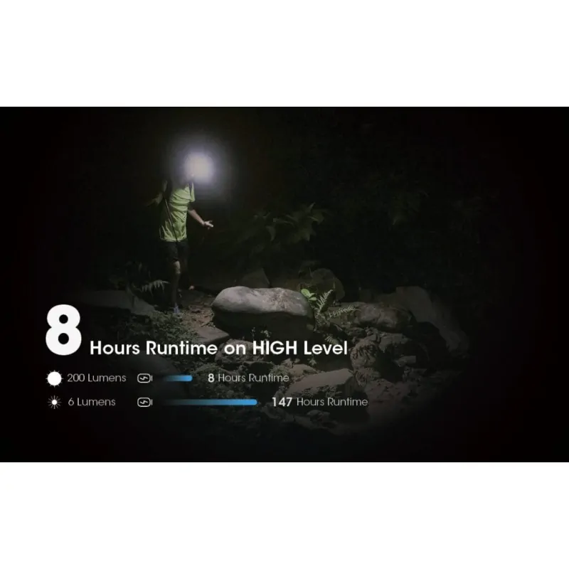 2. High - 200 lumens: 8 ώρες μέγιστος χρόνος λειτουργίας