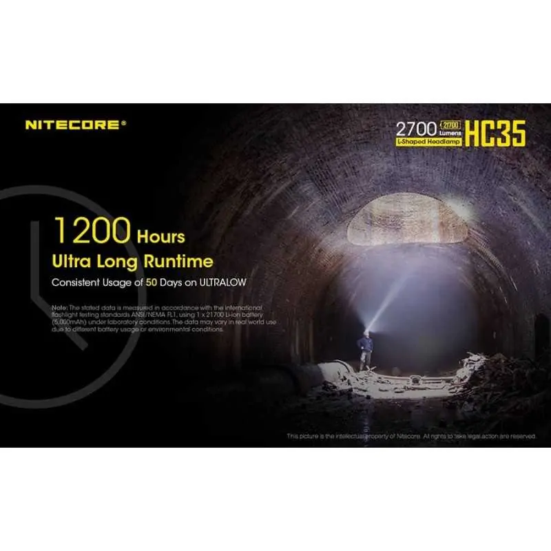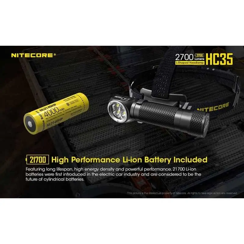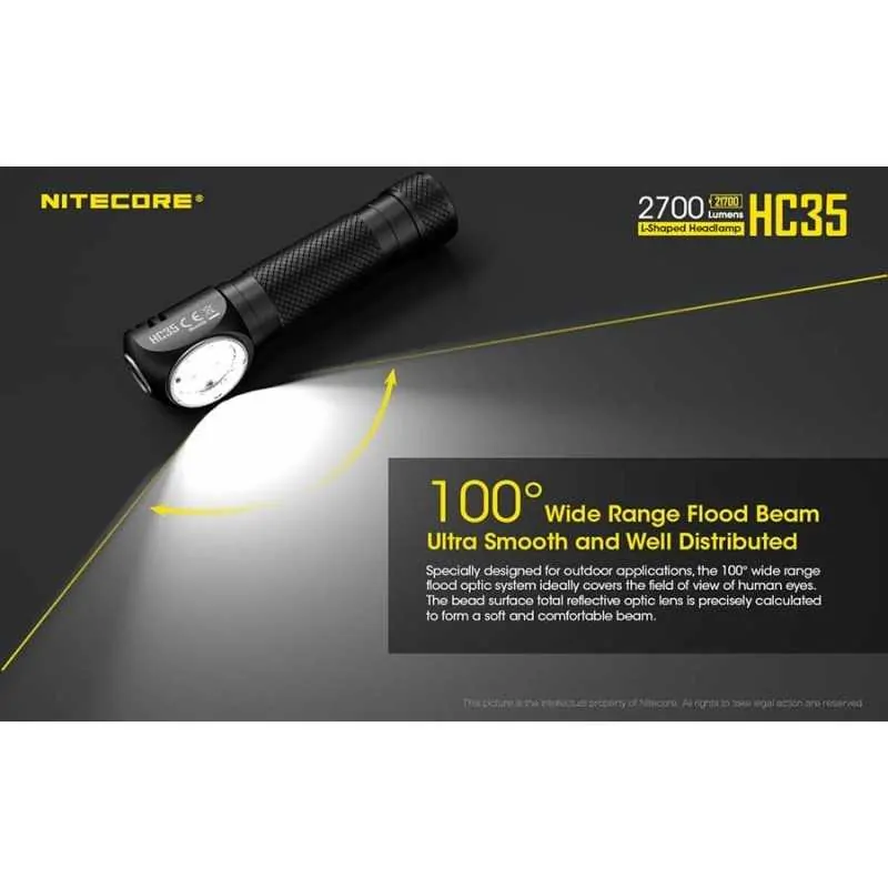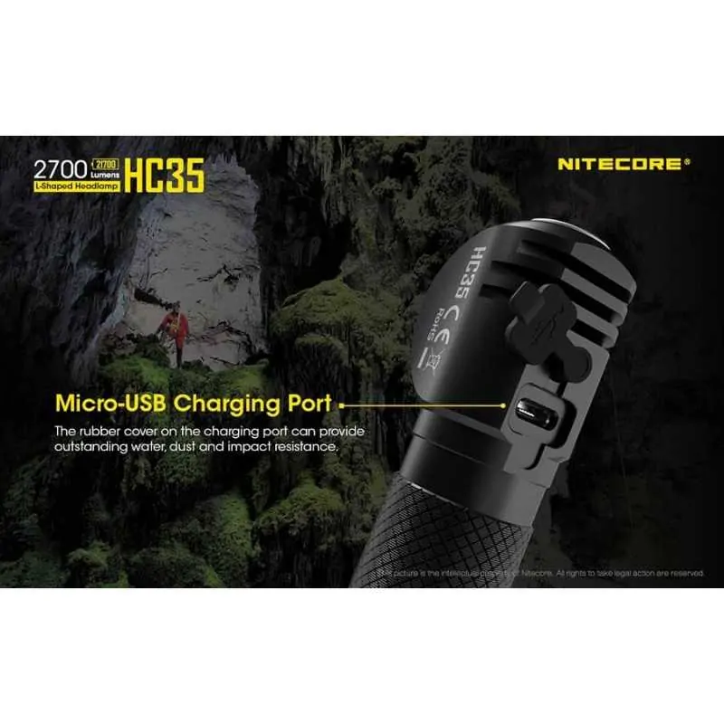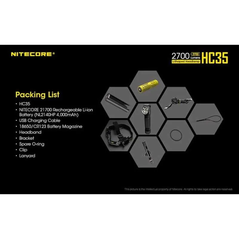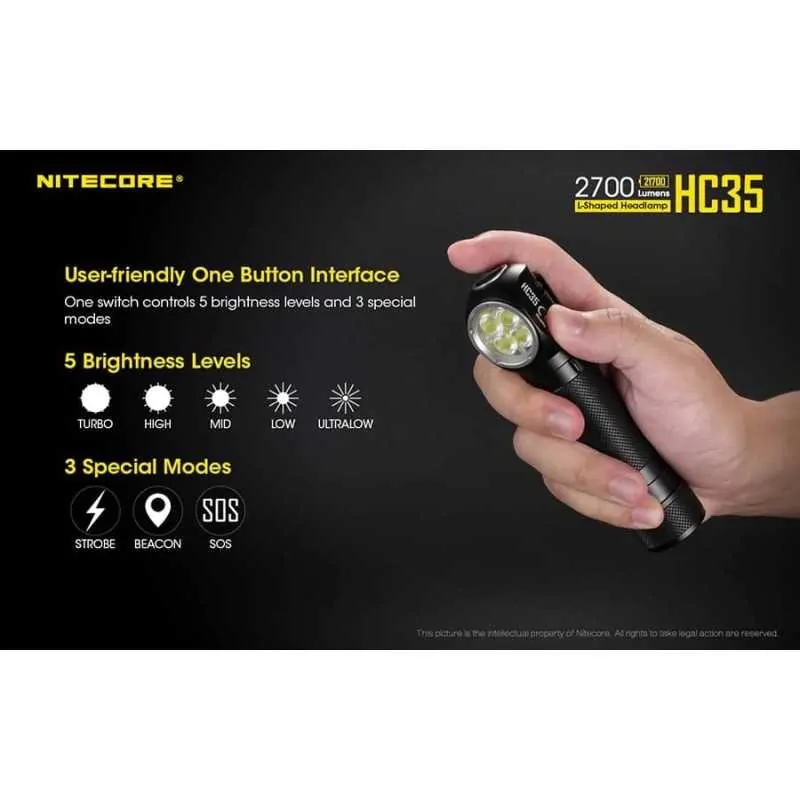 Ο επαναφορτιζόμενος φακός κεφαλής HC35 ανήκει στη νέα γενιά φακών κεφαλής της Nitecore σε σχήμα “Γ” . Δέχεται μπαταρία μεγέθους 21700 και διαθέτει ισχύ 2700 Lumens! Είναι εφοδιασμένος με 4 Led CREE XP-G3 S3 με μέγιστη ένταση 4500 κεριά και απόσταση 134 μέτρα. Οι λειτουργίες φωτισμού είναι οι εξής: