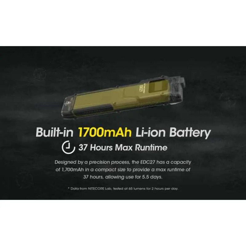 Μπορεί να παρέχει μέγιστη απόσταση που φθάνει τα 220 μέτρα ενώ παράλληλα διαχέει φωτεινότητα και στον περιβάλλοντα χώρο καθιστώντας τον φακό ιδανικό για εντοπισμό δρομολογίου και αναζήτηση σημάνσεων έτσι ώστε να διασφαλίζεται η ασφάλεια του χρήστη. Λεπτομέρειες φιλικές προς τον χρήστη, μελετημένη θέση για το δάχτυλο, ειδικά σχεδιασμένη για εύκολο σπρώξιμο προς τα κάτω και αποφυγή ατυχούς ενεργοποίησης όταν ο φακός τοποθετείται στην τσέπη. Μακρύ ισχυρό κλιπ από ανοξείδωτο ατσάλι περιλαμβάνεται. Με το ατσάλινο κλιπ μπορεί πολύ εύκολα να μεταφερθεί σε, σακίδιο, την επωμίδα, σε εσωτερική & εξωτερική τσέπη κ.α.. Πολυ-λειτουργική οθόνη OLED που παρουσιάζει πληροφορίες σε πραγματικό χρόνο(Lumens, Επίπεδο φωτεινότητας, Χρόνος που απομένει, Τάση μπαταρίας & Ενεργό Πρόγραμμα). Η ενσωματωμένη επαναφορτιζόμενη μπαταρία Li-ion χωρητικότητας 1700mAh προσφέρει μεγάλη διάρκεια λειτουργίας που φθάνει έως και 37 ώρες. Σχεδιασμένη με διαδικασία ακριβείας , ο EDC27 διαθέτει χωρητικότητα 1700mAh σε ένα μικρό μέγεθος έτσι ώστε να παρέχει ενέργεια έως και 37 ώρες. Αυτό επιτρέπει την χρήση του φακού για 5,5 ημέρες.