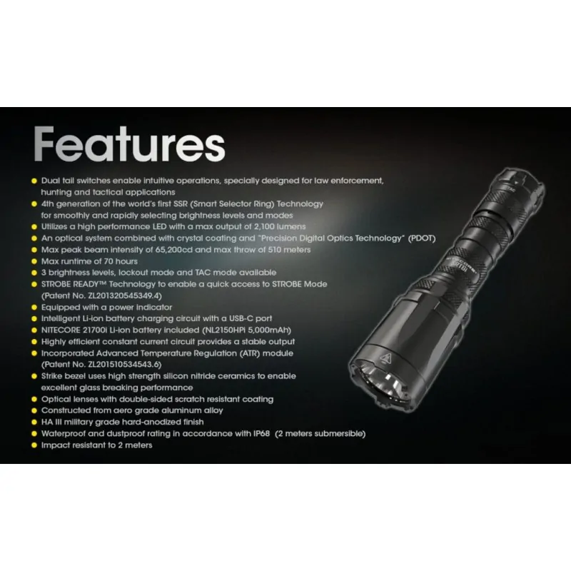 Είναι προστατευμένος ώστε να μπορεί να χρησιμοποιείται σε κάθε είδους περιβάλλον. Βαθμολογημένος με IP68 , υποβρύχιος έως και 2 μέτρα βάθος, ανθεκτικός σε πτώσεις έως και από 2 μέτρα ύψος, κρύσταλλο με αντι-χαρακτική επίστρωση και από τις δύο πλευρές του, κατασκευασμένος από κράμα αλουμινίου αεροναυπηγικής ποιότητας, φινίρισμα σκληρής ανοδίωσης στρατιωτικών προδιαγραφών HAIII. Επαναφορτιζόμενος από θύρα USB-C που δεν απαιτεί φορά στην τοποθέτηση του καλωδίου Το κάλυμμα της θύρας φόρτισης προστατεύει εξαιρετικά από το νερό , την σκόνη και τα χτυπήματα. Ένα εντελώς καινούριο αφαιρούμενο κλιπ συγκράτησης περιλαμβάνεται. Στερεώνεται με το καπάκι της ουράς και την υποδοχή για τον περιορισμό της μετατόπισης, επιτρέποντας την αποφυγή κουνήματος και την εξασφάλιση σταθερής τοποθέτησης. Πολύ μεγάλος χρόνος λειτουργίας που φθάνει τις 70 ώρες με την χρήση της χαμηλής έντασης των 30 lumens. Συνοδεύεται από μία επαναφορτιζόμενη μπαταρία Li-ion NL2150i / 5000mAh. Η μπαταρίες της σειράς “i” διαθέτουν και τους δύο πόλους (θετικό & αρνητικό) σε κάθε πλευρά.
