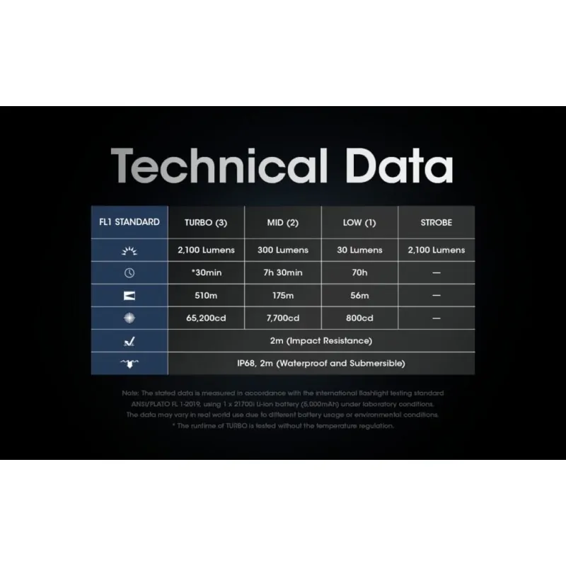 1. Turbo - 2100 lumens: 30 λεπτά μέγιστος χρόνος λειτουργίας
