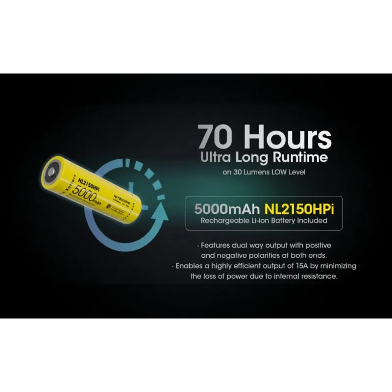 • Συνοδεύεται από μία επαναφορτιζόμενη μπαταρία Li-ion NITECORE NL2150HPi / 5000mAh