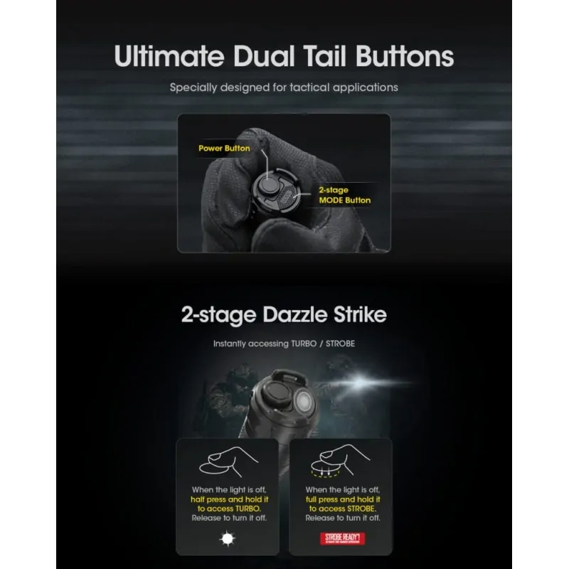 Ομαλή & Άμεση λειτουργία με τρία (3) επίπεδα φωτεινότητας και δύο (2) προγράμματα, ρύθμιση επιπέδων φωτεινότητας και επιχειρησιακός στιγμιαίος φωτισμός. Εξαιρετικά, διπλά κομβία στον οπίσθιο διακόπτη, ειδική σχεδίαση για επιχειρησιακές εφαρμογές με κομβίο ισχύος και κομβίο λειτουργιών 2 σταδίων. Εκθαμβωτικός φωτισμός 2 σταδίων με άμεση πρόσβαση στον μέγιστο φωτισμός TURBO και την ειδική φωτεινότητα STROBE. Όταν ο φακός είναι απενεργοποιημένος , πιέστε τον διακόπτη έως το μέσον της διαδρομής του για να μεταβείτε στην μέγιστη φωτεινότητα TURBO. Όταν ο φακός είναι απενεργοποιημένος, πιέστε τον διακόπτη έως το τέλος της διαδρομής του για να μεταβείτε στην ειδική φωτεινότητα STROBE. Δεύτερη γενιά λειτουργίας STROBEREADY™ . Εξαιρετική λειτουργία με το ένα χέρι (Ευρεσιτεχνία Νο. ZL201320545349.4). Τυχαία εναλλασσόμενη συχνότητα αναβοσβήματος στην ειδική φωτεινότητα STROBE Οι τυχαία εναλλασσόμενη συχνότητα μπορεί να προκαλέσει μεγαλύτερο αίσθημα ζάλης εξαιτίας της ανικανότητας των γυμνών ματιών να προσαρμοστούν. * Εύρος συχνότητας από 16Hz – 20Hz