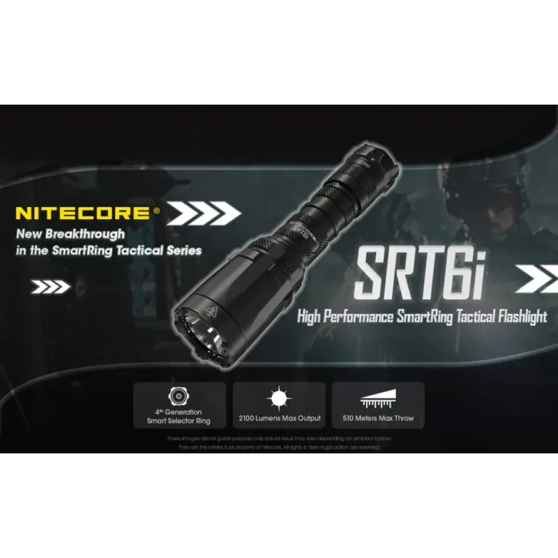 Ο SRT6i είναι ένας νέος καινοτόμος, υψηλής απόδοσης επιχειρησιακός φακός στην σειρά των φακών με τον έξυπνο δακτύλιο “SmartRing”. Περιστρεφόμενος δακτύλιος επιλογών 4ης γενιάς με μέγιστη ισχύς φωτεινότητας που φθάνει τα 2100 Lumens και μέγιστη απόσταση δέσμης φθάνει τα 510 μέτρα! Ο χειρισμός γίνεται εύκολα με το ένα χέρι. Ο έξυπνος περιστρεφόμενος δακτύλιος 4ης γενιάς και τα δύο επιχειρησιακά κομβία στο πίσω καπάκι είναι έτσι κατασκευασμένα ώστε να διευκολύνουν τον χειρισμό με το ένα χέρι ελέγχοντας τον ειδικό φωτισμό STROBE , το μέγιστο επίπεδο φωτεινότητας TURBO , το επιχειρησιακό πρόγραμμα TAC το πρόγραμμα κλειδώματος και τα επίπεδα φωτεινότητας. Ο 4ης γενιάς έξυπνος περιστρεφόμενος διακόπτης είναι ειδικά σχεδιασμένος για εύκολη επιλογή και ακριβή προ-επιλογή του επιπέδου φωτεινότητας ή των προγραμμάτων.