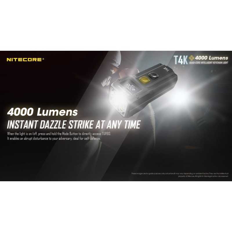 Ο T4K είναι ένας μικρός σε μέγεθος αλλά πανίσχυρος, επαναφορτιζόμενος φακός της NiteCore με μέγιστη φωτεινότητα 4000 lumens. Οι λειτουργίες φωτισμού είναι οι εξής: