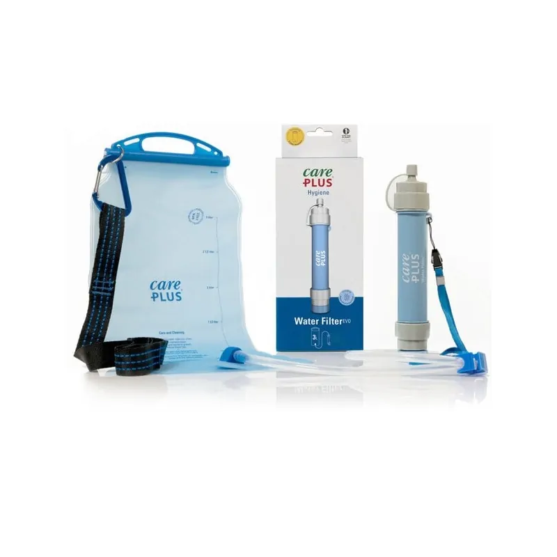 Το φίλτρο απολύμανσης νερού της Care Plus είναι μια πολύ καλή επιλογή για τα ταξίδια και τις περιπτώσεις ανάγκης. Απλά συμπληρώστε τον παρεχόμενο ασκό με νερό από πηγή, από ρυάκι ή από λίμνη, βιδώστε πάνω το φίλτρο και πιέστε ώστε να περάσει το νερό μέσα από το φίλτρο. Εναλλακτικά, γεμίστε ένα συνηθισμένο πλαστικό μπουκάλι νερού με το νερό που θέλετε να φιλτράρετε, βιδώστε το φίλτρο Eva της Care Plus στο στόμιο και πιέστε για να περάσει το νερό από το φίλτρο. Η συσκευασία περιλαμβάνει εύκαμπτο ασκό χωρητικότητας περίπου 3 λίτρων, σχεδιασμένο να μπορεί να επαναχρησιμοποιηθεί εκατοντάδες φορές.