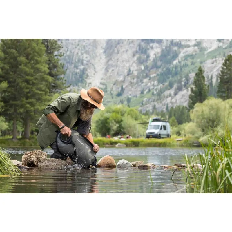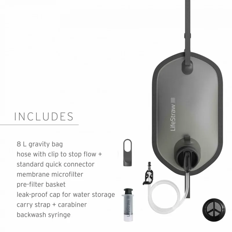 Το φίλτρο νερού της Lifestraw Peak Gravity με το σάκο μεταφοράς 8 λίτρων έχει πολύ καλή διαπερατότητα και υψηλή αποτελεσματικότητα φίλτρανσης και είναι κατάλληλο για μεγάλες ομάδες ανθρώπων ή πρόχειρους καταυλισμοούς. Έχει μέγεθος μόλις 35,6 x 59,7 cm και χαμηλό βάρος (536 gr) , ώστε να μην επιβαρύνει τον εξοπλισμό σας. Εξουδετερώνει 99,9999% των βακτηρίων και παρασίτων που αναπτύσσονται στο νερό όπως τα E.coli και η σαλμονέλα και το 99,9% των πρωτόζωων όπως τα Giardia και Cryptosporidium. Ακόμη, χάρη στη νέα τεχνολογία του φίλτρου, απομακρύνονται αποτελεσματικά τα μικροπλαστικά, η άμμος και η λάσπη από το νερό. Το φίλτρο είναι κατασκευασμένο από μικροσκοπικά λεπτές, εσωτερικά κενές, ίνες που δημιουργούν μια αποτελεσματικότατη μεμβράνη φίλτρανσης με διάρκεια ζωής περίπου 2.000 lt νερού.