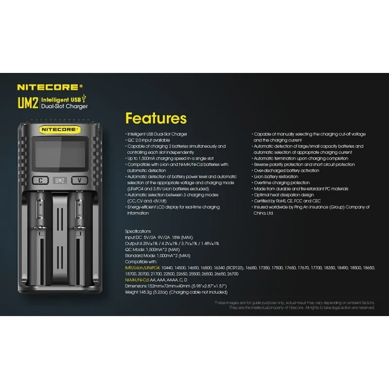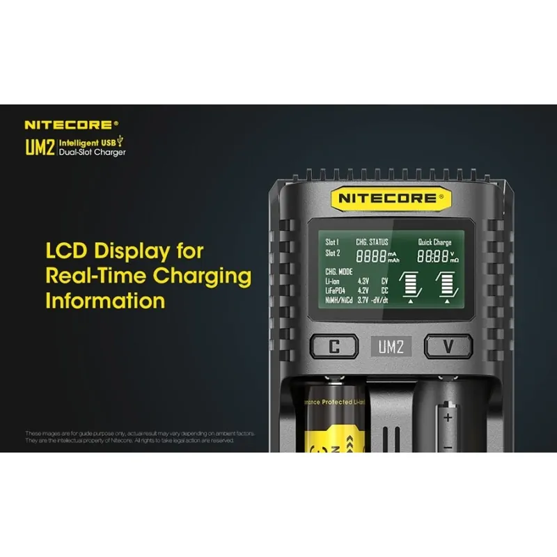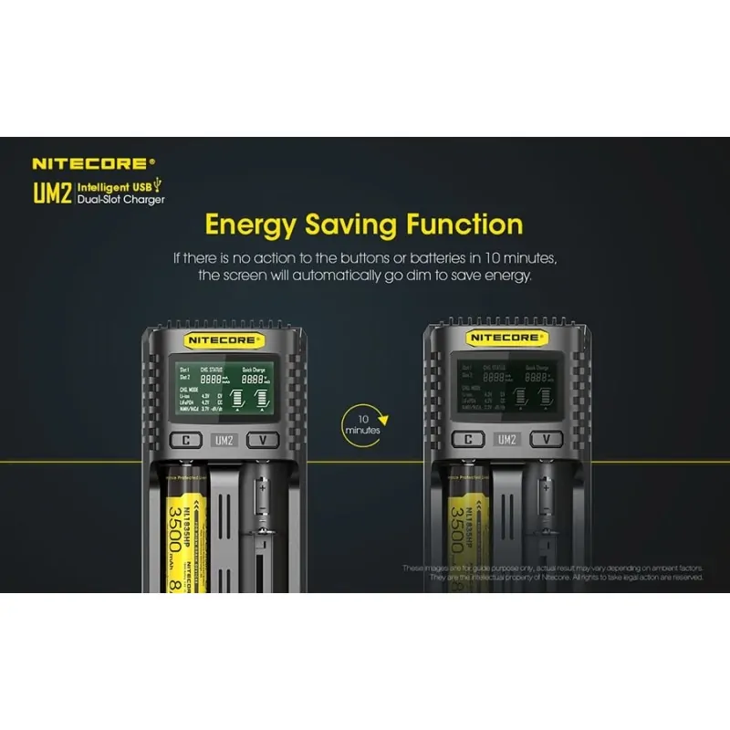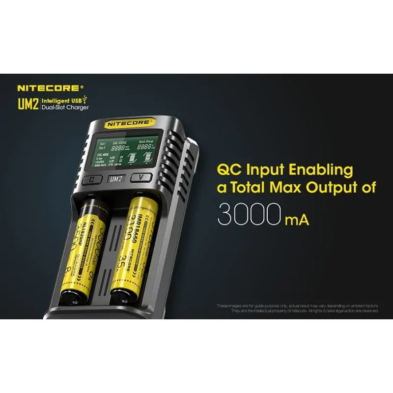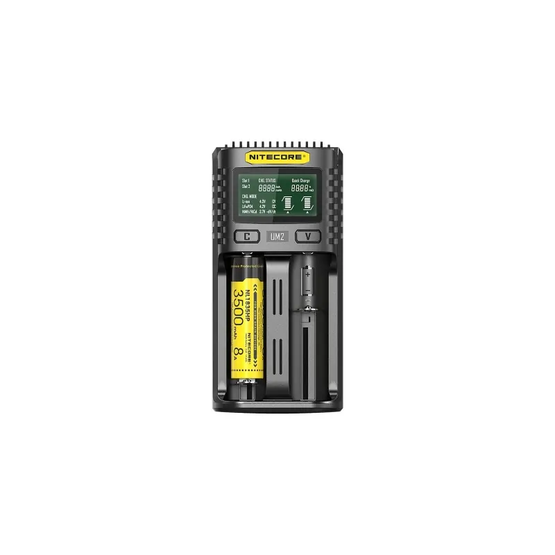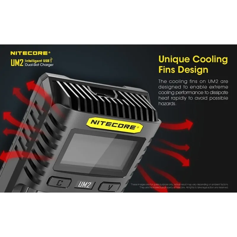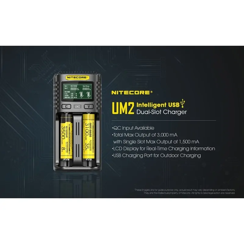 Ο UM2 της Nitecore είναι ένας έξυπνος φορτιστής από θύρες USB, με δύο θέσεις φόρτισης. Συμβατός με λειτουργία γρήγορης φόρτισης (QC). Μέγιστο ρεύμα φόρτισης έως και 3000mA, με μέγιστο ρεύμα φόρτισης σε μία θέση τα 1500mA. Με οθόνη υγρών κρυστάλλων (LCD) που δίνει σε πραγματικό χρόνο, πληροφορίες για την φόρτιση. Φορτίζει από θύρες USB, κάτι που του επιτρέπει να είναι ευέλικτος, φορητός και απαραίτητος σε εξορμήσεις στην φύση.