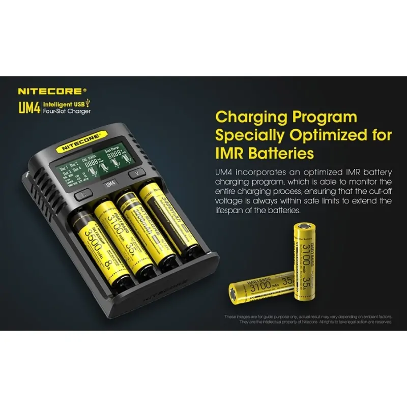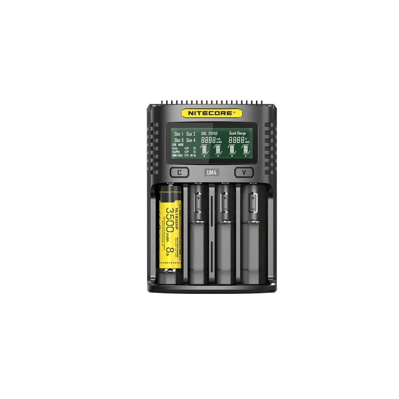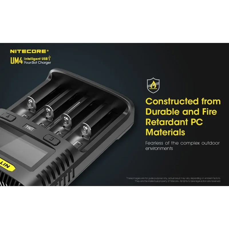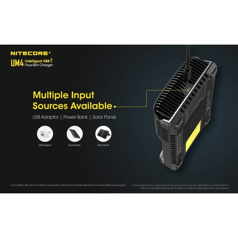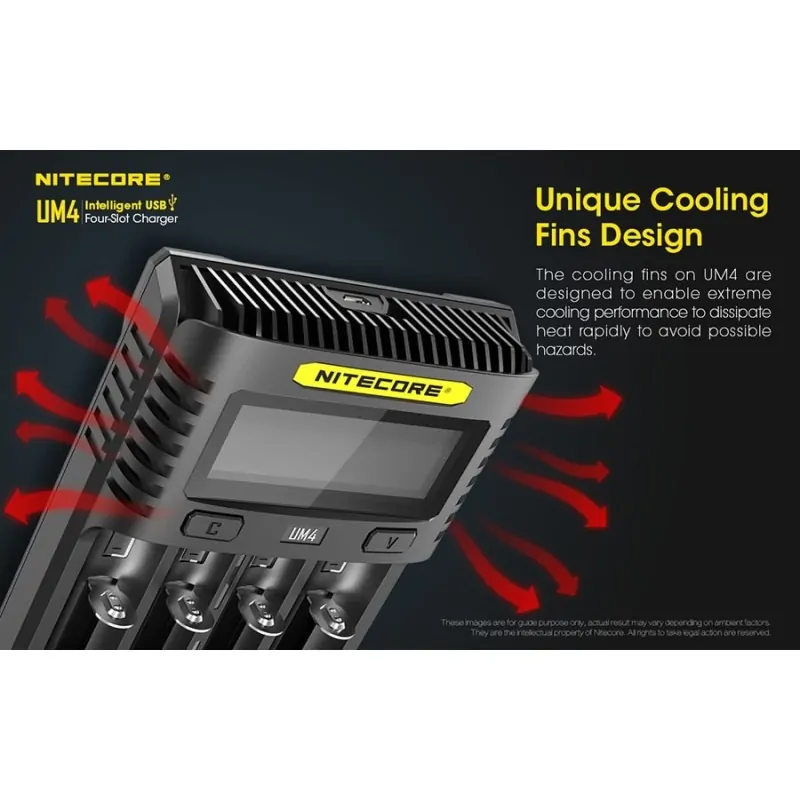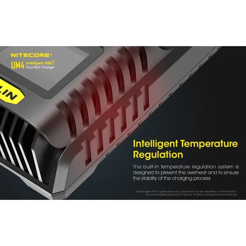 Ο UM4 της Nitecore είναι ένας έξυπνος φορτιστής από θύρες USB, με τέσσερις θέσεις φόρτισης. Συμβατός με λειτουργία γρήγορης φόρτισης (QC). Μέγιστο ρεύμα φόρτισης έως και 3000mA, με μέγιστο ρεύμα φόρτισης σε μία θέση τα 1500mA. Με οθόνη υγρών κρυστάλλων (LCD) που δίνει σε πραγματικό χρόνο, πληροφορίες για την φόρτιση. Φορτίζει από θύρες USB, κάτι που του επιτρέπει να είναι ευέλικτος, φορητός και απαραίτητος σε εξορμήσεις στην φύση.