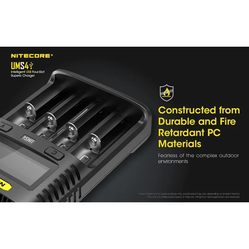 Ο UMS4 της Nitecore είναι ένας έξυπνος φορτιστής από θύρες USB, με τέσσερις θέσεις φόρτισης. Συμβατός με λειτουργία γρήγορης φόρτισης (QC 2.0). Μέγιστο ρεύμα φόρτισης έως και 4000mA, με μέγιστο ρεύμα φόρτισης σε μία θέση τα 3000mA, μπορεί να φορτίσει μία μπαταρία 18650/3500 σε 55 λεπτά. Με οθόνη υγρών κρυστάλλων (LCD) που δίνει σε πραγματικό χρόνο, πληροφορίες για την φόρτιση. Φορτίζει από θύρες USB, κάτι που του επιτρέπει να είναι ευέλικτος, φορητός και απαραίτητος σε εξορμήσεις στην φύση.