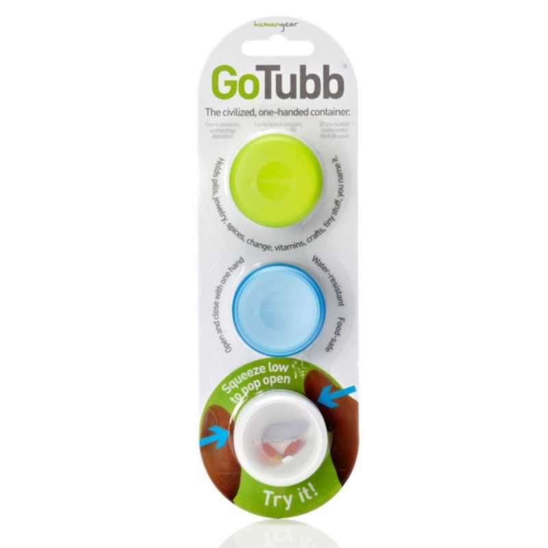 Το GoTubb της Humangear είναι ένα παγκοσμίως πατενταρισμένο προϊόν, κατασκευασμένο χωρίς χημικά πρόσθετα, BPA, φθαλικές ενώσεις και άλλες επιβλαβείς χημικές ουσίες. Είναι πολύ χρήσιμο και πρακτικό γιατί μπορεί να ανοίξει με το ένα χέρι πιέζοντας το με τα δάχτυλα στα πλάγια. Το σετ περιλαμβάνει 3 μικρά δοχεία σε διαφορετικά χρώματα για να τα ξεχωρίζετε εύκολα. Το GoTubb είναι ιδανικό για ταξίδια για να μεταφέρετε όλα τα μικρά πράγματα όπως χάπια, κουμπιά, γλυκά κ.λπ. Είναι αδιάβροχο, αλλά δεν ενδείκνυνται για την μεταφορά υγρών. Μερικές ιδέες για το τι μπορείτε να μεταφέρετε: