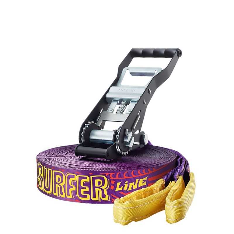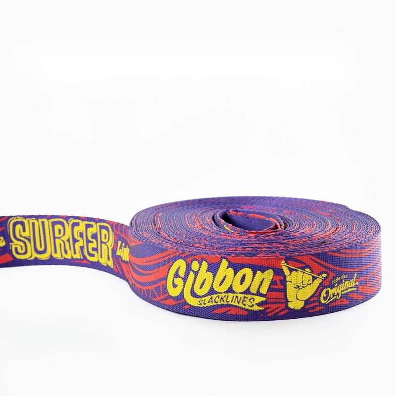 Το μοντέλο Surferline της Gibbon είναι πιο δυναμικό από τα υπόλοιπα slacklines, σχεδιασμένο ώστε να δίνει περισσότερο την αίσθηση του "τραμπολίνου". Είναι το ιδανικό slackline για να κάνεις κόλπα και tricklining. Είναι κατάλληλο για ενήλικες. Το σετ αυτό περιλαμβάνει και το ειδικό προστατευτικό της Gibbon που προστατεύει το φλοιό των δέντρων από τις μεγάλες δυνάμεις που ασκούνται από τον ιμάντα ισορροπίας. Το treewear τυλίγεται και στερεώνεται εύκολα γύρω από τον κορμό του δέντρου με velcro. Ο ιμάντας έχει μήκος 27,5 m και πλάτος 5 cm και την πατενταρισμένη καστάνια Ratpad της Gibbon μαζί με τον δευτερεύοντα ιμάντα πρόσδεσης των 2,5 m με ενισχυμένη θηλιά για το δέσιμο στη μια πλευρά. Διαθέτει εργονομικά βελτιστοποιημένη πλαστική λαβή καστάνιας επιτρέποντας άνετο και αποτελεσματικό τέντωμα. Επίσης όλα τα μέρη της καστάνιας που βρίσκονται υπό τάση είναι μεταλλικού χρώματος και δεν πρέπει να τα αγγίζετε για λόγους ασφαλείας. Τα μέρη της καστάνιας που είναι βαμμένα με μαύρο χρώμα, είναι ασφαλές να τα πιάσετε ή να τα ακουμπήσετε. Αυτό έχει ως αποτέλεσμα να αυξάνει την ασφάλεια κατά τη χρήση της καστάνιας.