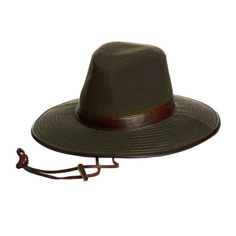 Το καπέλο Safari Oilskin είναι από 100% βαμβάκι οι ίνες του οποίου έχουν υποστεί επεξεργασία με λάδι και κερί και έχουν αποκτήσει υδροφοβικές ιδιότητες. Είναι διαθέσιμο σε όμορφο σκούρο καφέ χρώμα με όμορφο πλατύ γείσο πλάτους 8 cm για άριστη προστασία από τον ήλιο και τον αέρα. Κρατάει τη φόρμα του ακόμα και αν μείνει διπλωμένο για καιρό. Διατίθεται σε 3 μεγέθη (μετρήστε την περίμετρο του κεφαλιού στο ύψος του μετώπου).