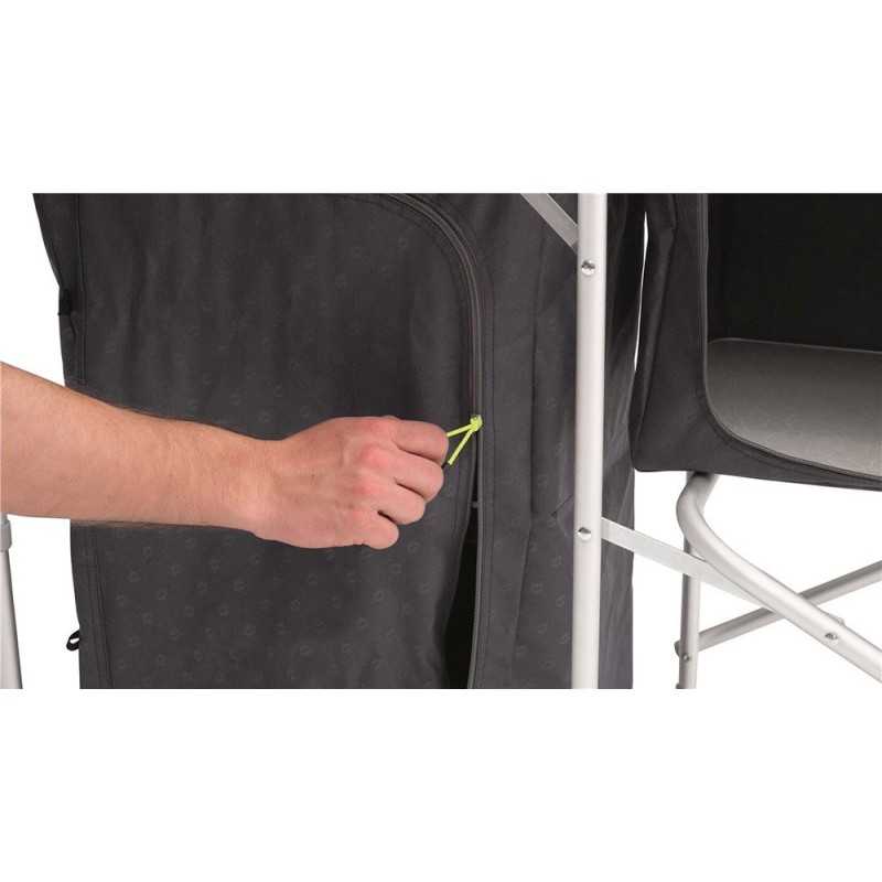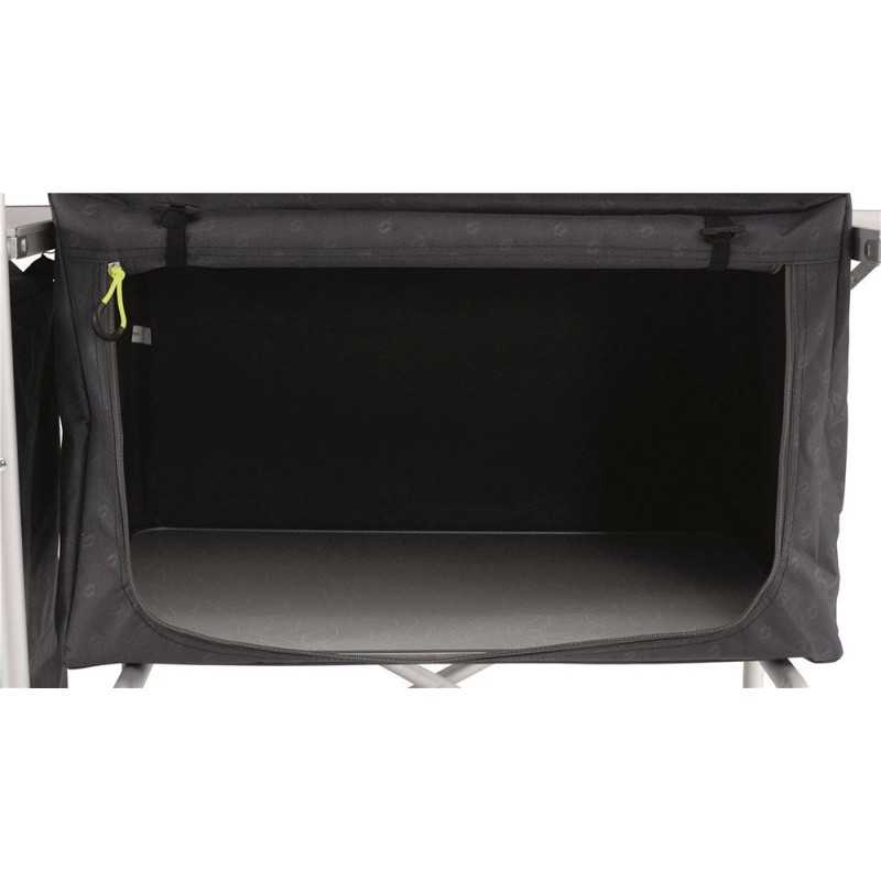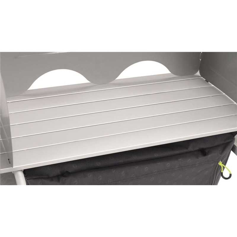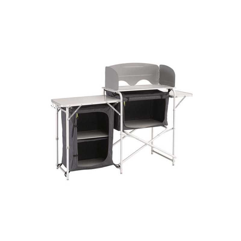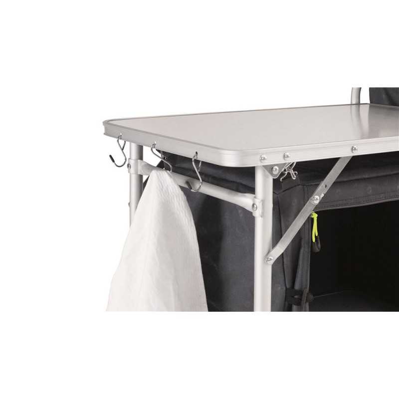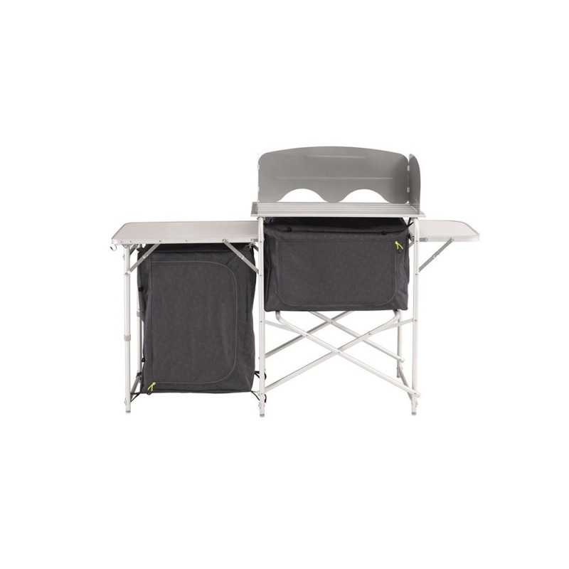 Πτυσσόμενος πάγκος κουζίνας της Outwell, ο οποίος διπλώνει και ανοίγει μέσα σε δευτερόλεπτα χωρίς να απαιτεί πολύπλοκη συναρμολόγηση. Το κεντρικό τραπέζι του πάγκου είναι ρολό αλουμινίου με αποσπώμενο ανεμοφράχτη για ασφαλές αλλά και οικονομικό μαγείρεμα. Διαθέτει 3 γάντζους στο πλάι, για να κρέμασετε τις πετσέτες, τα γάντια σας και ότι άλλο χρειαστεί να έχετε δίπλα σας. Για την καλύτερη οργάνωση των πραγμάτων σας υπάρχουν 2 ντουλάπια, που κλείνουν με φερμουάρ, στο κάτω μέρος του πάγκου για να αποθηκεύεται όλα τα είδη κάμπινγκ σας. Συνοδεύεται από πρακτική τσάντα για εύκολη μεταφορά.