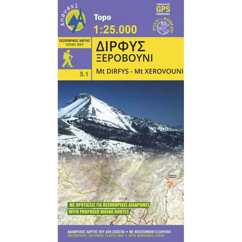 Πεζοπορικός χάρτης για τη Δίρφη και το Ξεροβούνι σε κλίμακα 1:25 000. Το ψηλότερο βουνό της Εύβοιας μαζί με το γειτονικό του Ξεροβούνι προσφέρουν μια ενδιαφέρουσα ποικιλία από διαδρομές - άλλες μέσα σε πλούσια δάση καστανιάς κι άλλες με καταπληκτική θέα προς το Αιγαίο. Θετικά στοιχεία η σύντομη προσπέλαση από την Αθήνα και η ύπαρξη φυλασσόμενου καταφυγίου. Στο χάρτη περιλαμβάνονται 7 προτεινόμενες πεζοπορικές διαδρομές σε Δίρφυ και Ξεροβούνι. Κατασκευασμένος από χαρτί polyart.
