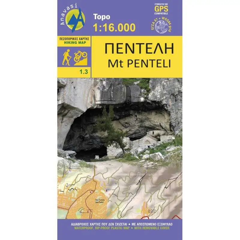 Πεζοπορικός χάρτης της Πεντέλης σε κλίμακα 1:16 000. Ο πεζοπορικός χάρτης της Πεντέλης [1.3] από την Ανάβαση, σε κλίμακα 1:16 000 προτείνει τη γνωριμία με το αττικό βουνό μέσα από πεζοπορικές και ποδηλατικές διαδρομές, που ξεκινούν από τις παρυφές του, το Διόνυσο, την Εκάλη, την Κηφισιά, την Πεντέλη και τα Μελίσσια. Εκτός από τα μονοπάτια αποτυπώνονται όλα τα παλιά λατομεία, οι σπηλιές και τα μνημεία, όπως η περίφημη οδός λιθαγωγίας, απ' όπου μεταφέρονταν τα μάρμαρα του Παρθενώνα. Ο χάρτης είναι τυπωμένος σε αδιάβροχο χαρτί polyart.