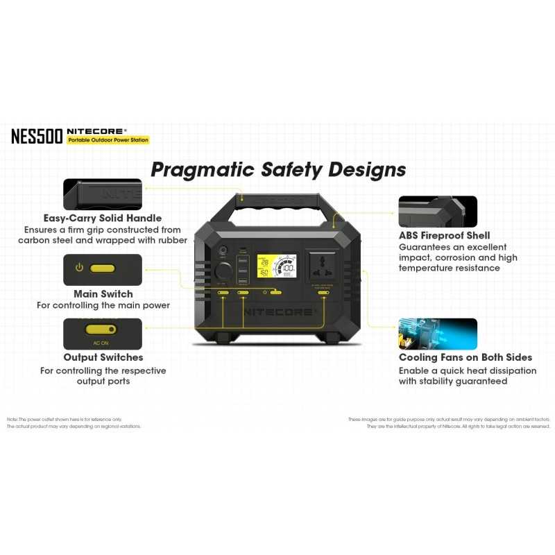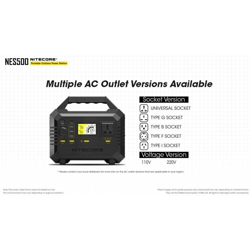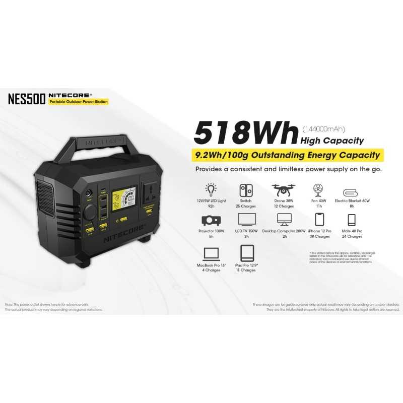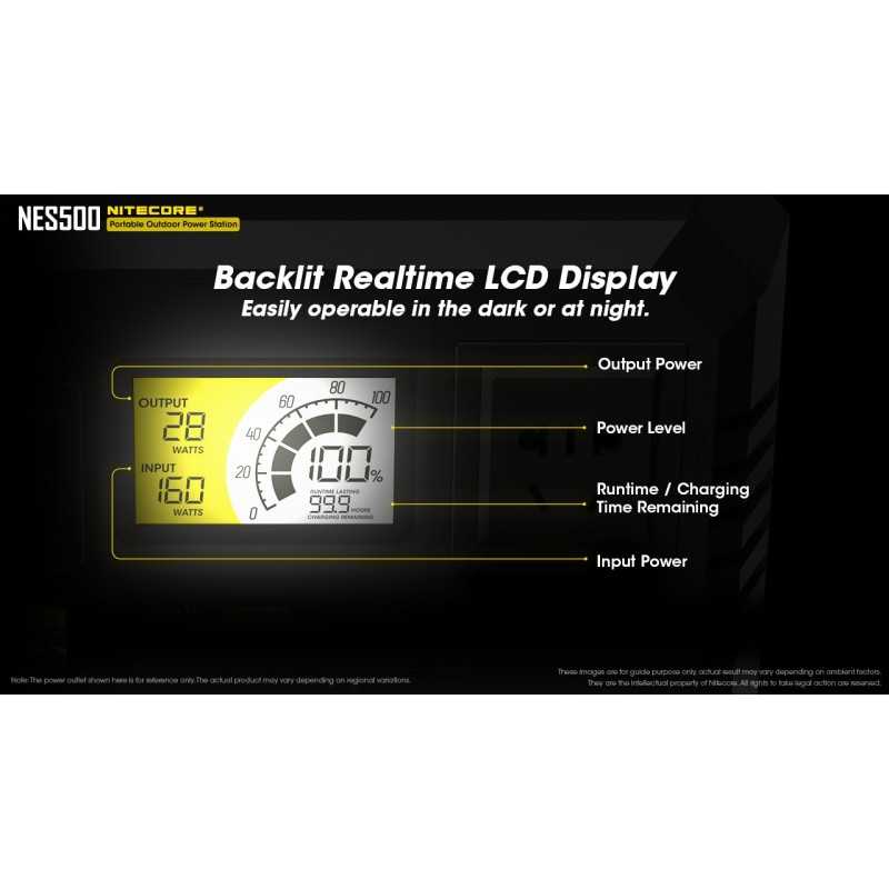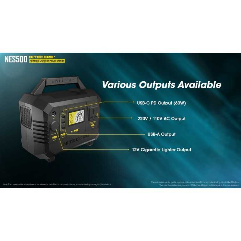 Το Power Station NES500 της Nitecore αποτελεί μια έξυπνη φορητή λύση ενέργειας για τις περιπτώσεις που χρειάζεστε ρεύμα εκτός δικτύου (εκδρομές, κάμπινγκ, blackout, εξοχικό, βάρκα κλπ). Μπορεί να φορτίσει από την πρίζα (220V), από αναπτήρα αυτοκινήτου (12V) ή από ηλιακό πάνελ (συνδυάζεται τέλεια με το φωτοβολταϊκό πάνελ FSP100 και FSP100W της Nitecore). Έχει πολλαπλές θύρες εξόδου για κάθε πιθανή χρήση: USB-C, 220V, 110V, USB-A και 12V.