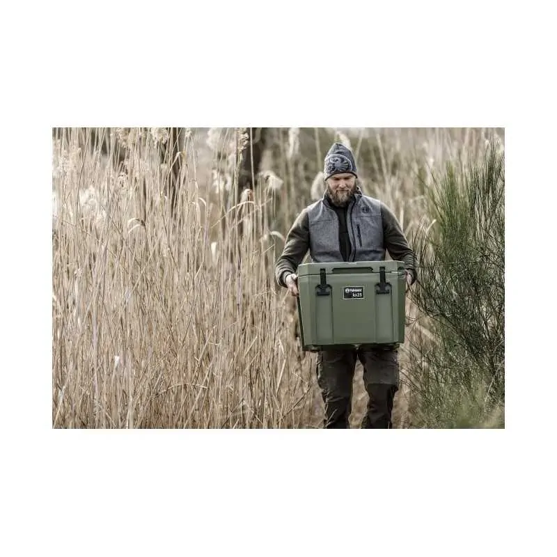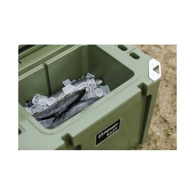Με ένα μονωτικό στρώμα τουλάχιστον 45 mm εξασφαλίζεται σταθερή θερμοκρασία για τη διατήρηση των τροφίμων και των ποτών. Επιπλέον, είναι κατασκευασμένο από ισχυρό πολυαιθυλένιο(PE) για μεγαλύτερη αντοχή, ώστε το kx25 να μπορεί να χρησιμοποιηθεί και ως υπερυψωμένη βάση ή άνετο κάθισμα. Χάρη στην μορφή του μπορεί να αποθηκευτεί εύκολα χωρίς να σας ταλαιπωρεί. Το ενσωματωμένο σύστημα αποστράγγισης επιτρέπει την εύκολη αποστράγγιση του λιωμένου νερού, γεγονός που απλοποιεί την αναπλήρωση του πάγου κατά τη χρήση καθώς και τον μετέπειτα καθαρισμό.