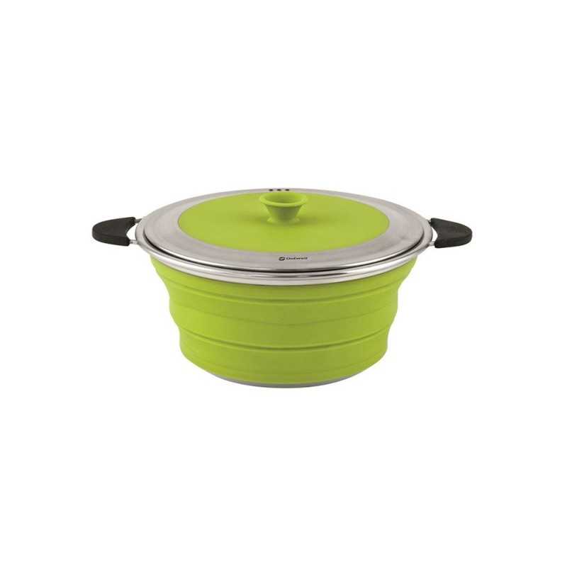 Πρακτική πτυσσόμενη κατσαρόλα της Outwell, ειδικά σχεδιασμένη για τη μέγιστη δυνατή εξοικονόμηση χώρου και βάρους στον εξοπλισμό σας. Τα τοιχώματα είναι από σιλικόνη η οποία είναι κατάλληλη για τρόφιμα, υψηλής αντοχής και χωρίς BPA (εγκεκριμένη από την FDA και την EU). O πάτος είναι από ανοξείδωτο ατσάλι για να αντέχει τη φλόγα από τη φωτιά σας. Στο χείλος της κατσαρόλας υπάρχει ενσωματωμένο ανοξείδωτο δαχτυλίδι το οποίο προσφέρει άριστη σταθερότητα στο καπάκι. Το καπάκι είναι εξαιρετικά ανθεκτικό, με τρύπες αποστράγγισης στο πλάι (για μακαρόνια, ρύζι κλπ).