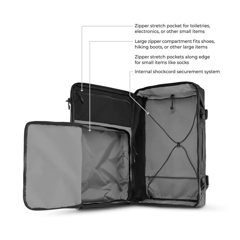 Με χωρητικότητα 45 λίτρων, αυτό το σακίδιο προσφέρει άφθονο χώρο για όλα τα απαραίτητα για το ταξίδι σας. Πολλαπλές θήκες, συμπεριλαμβανομένης μιας μεγάλης κύριας θήκης, μιας θήκης για φορητό υπολογιστή με επένδυση αλλά και πολλών μικρότερων θηκών, διασφαλίζουν ότι τα υπάρχοντά σας παραμένουν οργανωμένα και εύκολα προσβάσιμα. Πείτε αντίο στο να ψαχουλεύετε την τσάντα σας αναζητώντας ένα συγκεκριμένο αντικείμενο!