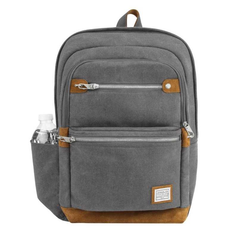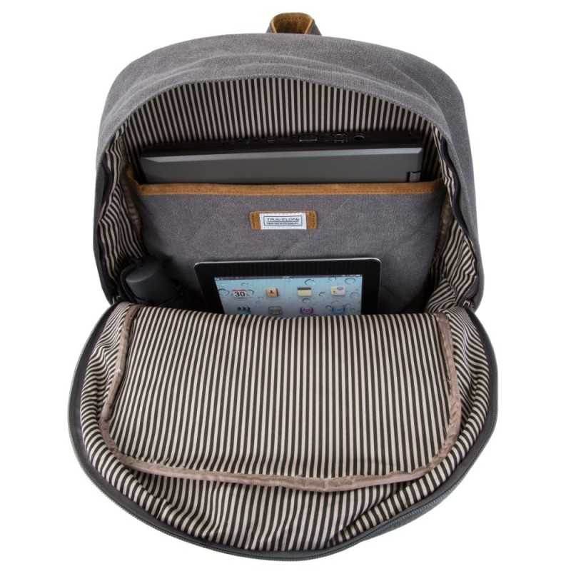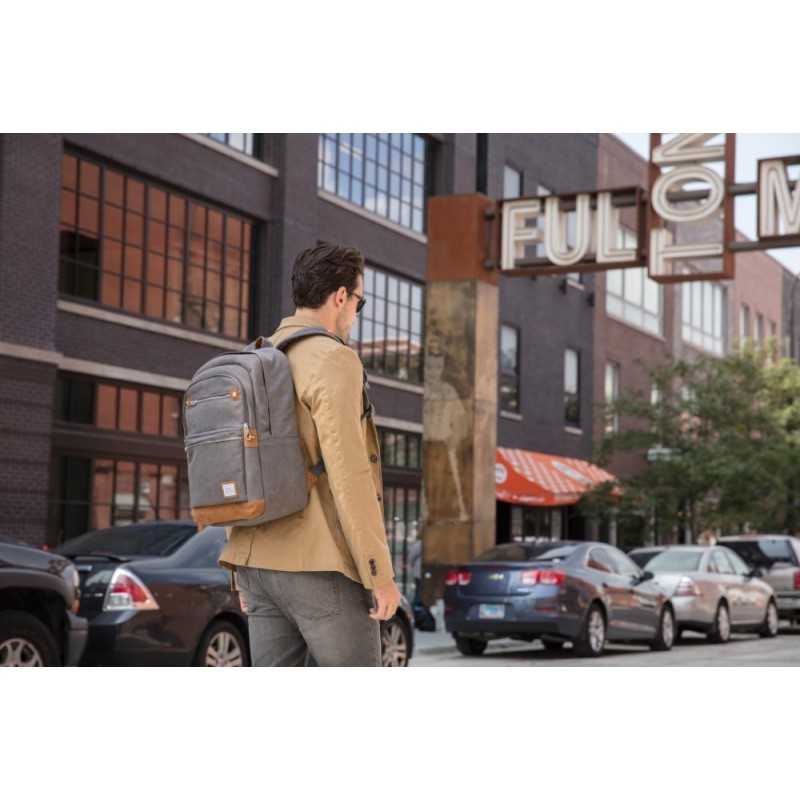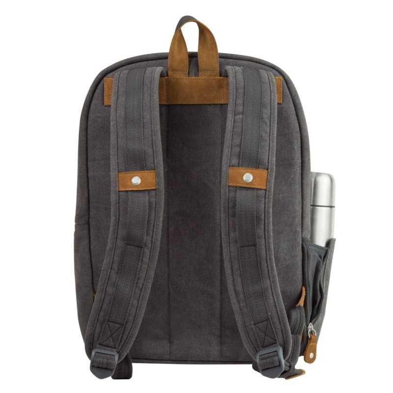 Ζυγίζει σχεδόν ένα κιλό και είναι κατασκευασμένο από ανθεκτικό πολυεστέρα με βαμβάκι και δέρμα σουέντ στα σημεία ενίσχυσης, ένα πολύ ανθεκτικό ύφασμα με υδρόφοβες ιδιότητες που δεν λερώνει εύκολα. Έχει χωρητικότητα 22 λίτρων και διαθέτει εσωτερικές τσέπες για καλύτερη ορεγάνωση των πραγμάτων σας. Επιπλέον, εσωτερικά υπάρχει θήκη, επενδεδυμένη με fleece, για το λάπτοπ ή το tablet, και θήκες για τις κάρτες σας και το διαβατήριό σας με σύστημα RFID Block που εμποδίζει την υποκλοπή των προσωπικών σας δεδομένων. Τέλος, εσωτερικά υπάρχει και μπρελόκ για τα κλειδιά σας με φωτάκι LED. Εξωτερικά, υπάρχει στο πλάι θήκη για να τοποθετήσετε τα αντικείμενα στα οποία θέλετε να έχετε άμεση πρόσβαση, καθώς και υποδοχή για ένα μπουκάλι ή παγούρι νερού.