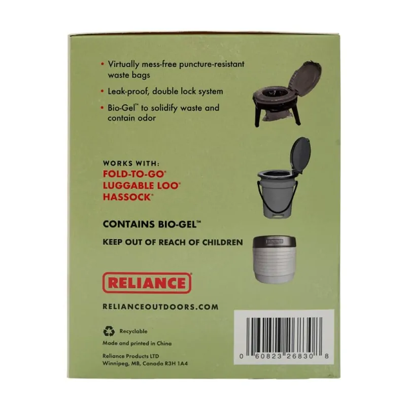 Οι στεγανές σακούλες Double Doodie με ειδικό bio gel σας προσφέρουν την άνεση μιας τουαλέτας χωρίς ακαταστασία και οσμές, όταν για κάποιο λόγο βρίσκεστε μακριά από κανονικές τουαλέτες. Είναι ειδικά σχεδιασμένες για χρήση με την φορητή τουαλέτα της Reliance ώστε πραγματικά να νοιώθετε σαν στο σπίτι σας. Η φορητή τουαλέτα της Reliance είναι πολύ χρήσιμη σε ανακαινίσεις σπιτιών, σε μετακομίσεις, σε πολύωρες διακοπές υδροδότησης και σε περιπτώσεις που για κάποιο λόγο δεν λειτουργεί ή δεν είστε κοντά στην κανονική τουαλέτα του σπιτιού σας.