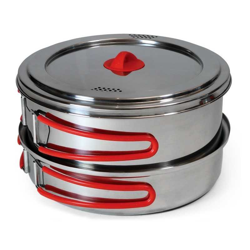 Εξαιρετικής ποιότητας ανοξείδωτο σετ μαγειρέματος για 3-4 άτομα. Όλα τα σκεύη αποθηκεύονται το ένα μέσα στο άλλο για εξοικονόμηση χώρου. Η ποιότητα κατασκευής αλλά και ο σχεδιασμός είναι κλασικός και διαχρονικός, χωρίς περιττά στοιχεία που προσθέτουν βάρος. Το ανοξείδωτο ατσάλι (ποιότητας 18/10) προσφέρει υψηλή αντοχή στο χρόνο και εύκολο καθάρισμα, κάτι εξαιρετικά χρήσιμο σε ένα μαγείρεμα στην κατασκήνωση. Τα χερούλια είναι αναδιπλούμενα, με σιλικόνη, για μέγιστη εξοικονόμηση χώρου αλλά και προστασία από το κάψιμο.