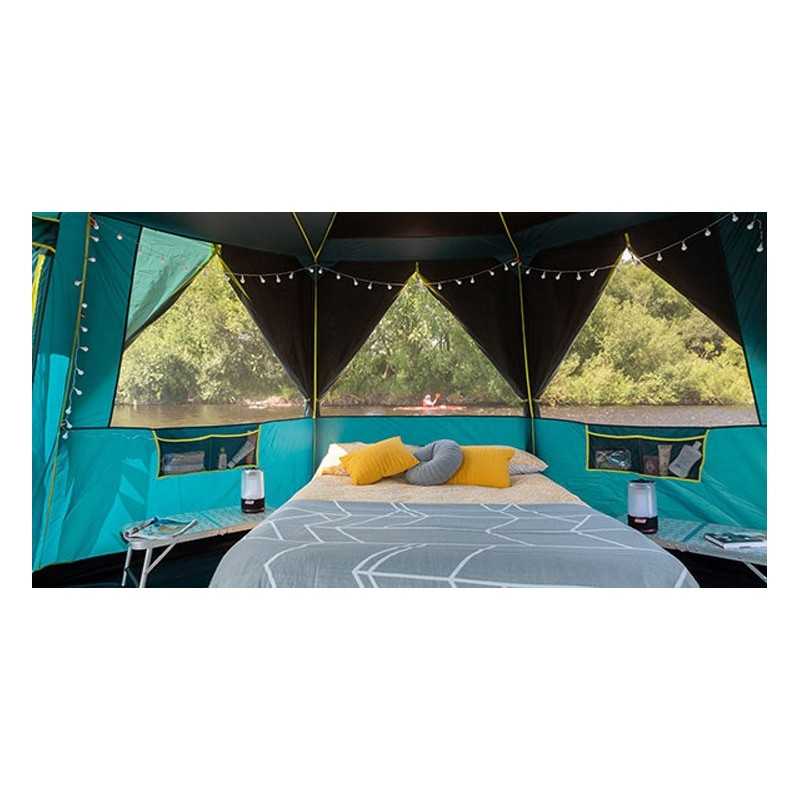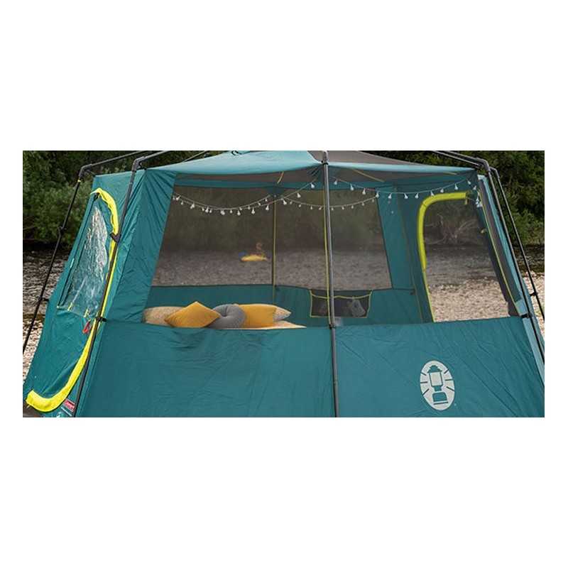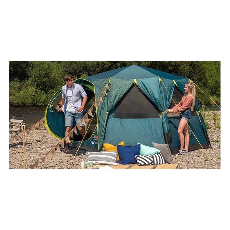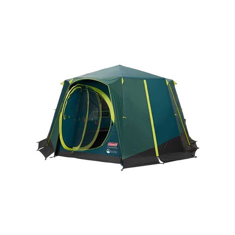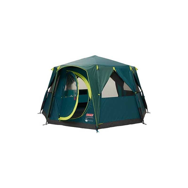Η Octagon Blackout 8 της Coleman είναι μια ευρύχωρη οκτάγωνη σκηνή που μπορεί να χωρέσει άνετα 8 ατόμα. Μπορείτε αν θέλετε να ανοίξετε τα παράθυρα για επιπλέον εξαερισμό και περισσότερη δροσιά το καλοκαίρι. Παράθυρα με σίτα υπάρχουν σε όλη την περίμετρο της σκηνής, επομένως ανοίγετε ή κλείνετε αυτά που σας βολεύουν κάθε φορά (για παράδειγμα, ανάλογα που βρίσκεται ο ήλιος ή από που φυσάει). Διαθέτει ανθεκτικό, αδιάβροχο πάτωμα από πολυαιθυλένιο και στιβαρό σκελετό από ατσάλι και fiberglass, ο οποίος στήνεται πολύ εύκολα. Εσωτερικά είναι σε σκούρο χρώμα (BlackOut Bedroom®), το οποίο βοηθάει στον ύπνο, καθώς μειώνει το φως που μπαίνει μέσα στη σκηνή. Έχει επίσης μεγάλη πόρτα σχήματος D για εύκολη πρόσβαση στο εσωτερικό της (θα σας ενθουσιάσει ο μηχανισμός της πόρτας που ανοιγοκλείνει χωρίς φερμουάρ!), ενώ μαζεύεται σε σάκο μεταφοράς για να την έχετε πάντα μαζί σας στις εξορμήσεις σας στη φύση. Ιδανική για ζεστά κλίματα και για το ελληνικό καλοκαίρι.