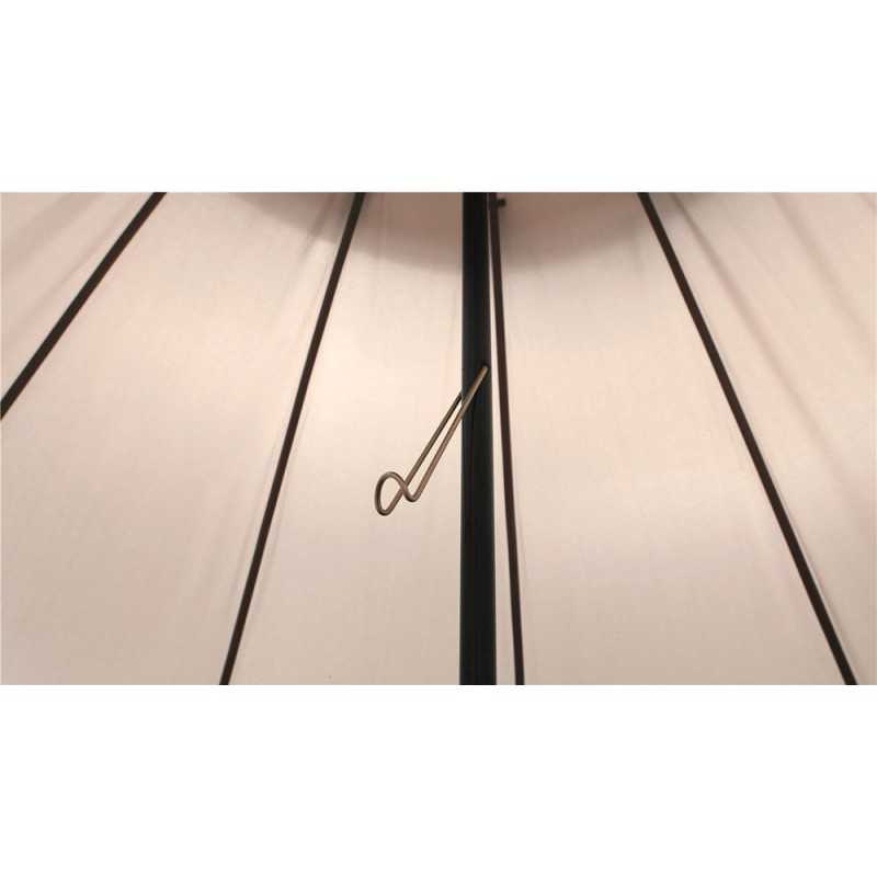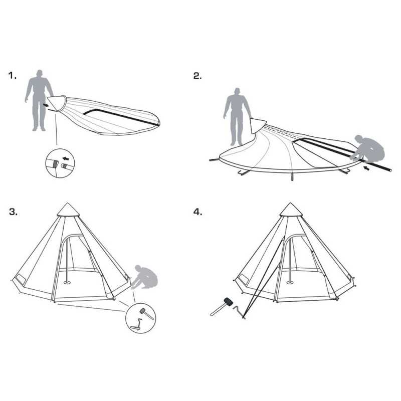 Οδηγίες στησίματος: Το πρώτο βήμα είναι να φτιάξουμε την κορυφή της σκηνής τοποθετώντας την μπανέλα στην ειδικά διαμορφωμένη σχισμή στο ύφασμα. Μετά φτιάχνουμε τον λεπτό στύλο και τον τοποθετούμε μέσα στο μεγαλύτερο στύλο, βάζοντας το μέσα στην σκηνή. Τέλος ρυθμίζουμε το επιθυμητό ύψος και τοποθετούμε τα πασαλάκια και τους εντατήρες για να τεντώσουμε την σκηνή.