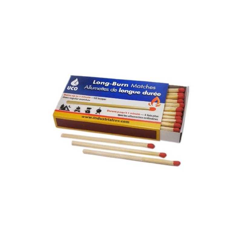 Τα σπίρτα μακράς καύσης της UCO έχουν σχεδιαστεί για να ανάβουν φωτιά σε υλικά που χρειάζονται μεγαλύτερο χρόνο προθέρμανσης ή σε μεγάλες εστίες όπου πρέπει να ανάψουν σε πολλά σημεία. Η διάρκεια καύσης τους είναι 5 φορές μεγαλύτερη από αυτή των συνηθισμένων σπίρτων. Η φωτιά στο τζάκι, στο μπάρμπεκιου αλλά και τα κεριά σε μια τούρτα γενεθλίων χρειάζονται μεγάλο αριθμό σπίρτων για να ανάψουν, αλλά μόνο ένα σπίρτο μακράς καύσης. Τα σπίρτα μακράς καύσης UCO είναι πολύ χρήσιμα στο σπίτι αλλά και στην κατασκήνωση στην ύπαιθρο. Κάθε κουτί περιέχει 50 σπίρτα.